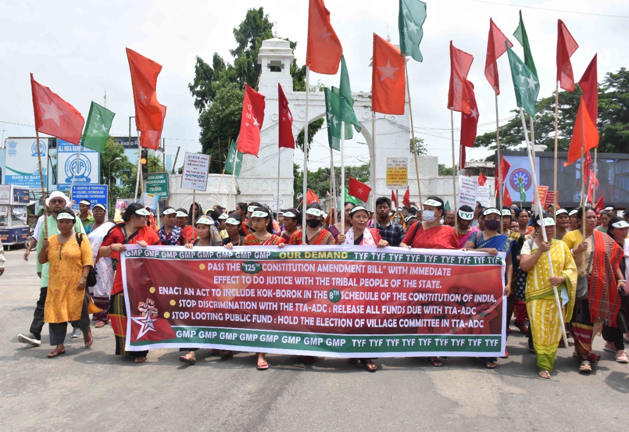 পড়লেন। তরুনদের সমবেত উচ্ছাসের ভিড়ে বের হল সাংবিধানিক সমাধান। জলোচ্ছাসের মত যে উচ্ছাস দেখা দিয়েছিল তা যেন মিইয়ে গেল। পাহাড়ে চলছে চরম আর্থিক সংকট, কাজ নেই, পানীয় জল নেই, যোগাযোগ ব্যবস্থা ভেঙ্গে পড়েছে। এ নিয়ে কোন কথা নেই তিপরা মথা নেতাদের মুখে। জনজীবনের সেই আওয়াজ নিয়েই গণমুক্তি পরিষদ রাজভবন অভিযানে নেমে শক্তির জানান দিল। কিভাবে মিথ্যা প্রতিশ্রুতি দিয়ে বিজেপি ক্ষমতায় এসেছে, তিপরা মথা কিভাবে বিজেপি-র জনবিরোধী নীতিগুলোকে সমর্থন করছে তার তথ্য তুলে ধরেন নেতৃবৃন্দ। নেতৃত্বদের মধ্যে উপস্থিত ছিলেন প্রাক্তন মুখ্যমন্ত্রী মানিক সরকার, বিরোধী দলনেতা জীতেন্দ্র চৌধুরী, জি এম পি সাধারণ সম্পাদক রাধাচরণ দেববর্মা, নরেশ জমাতিয়া, যুব নেতা কুমুদ দেববর্মা ছাত্র নেতা সুজিত ত্রিপুরা প্রমুখ।